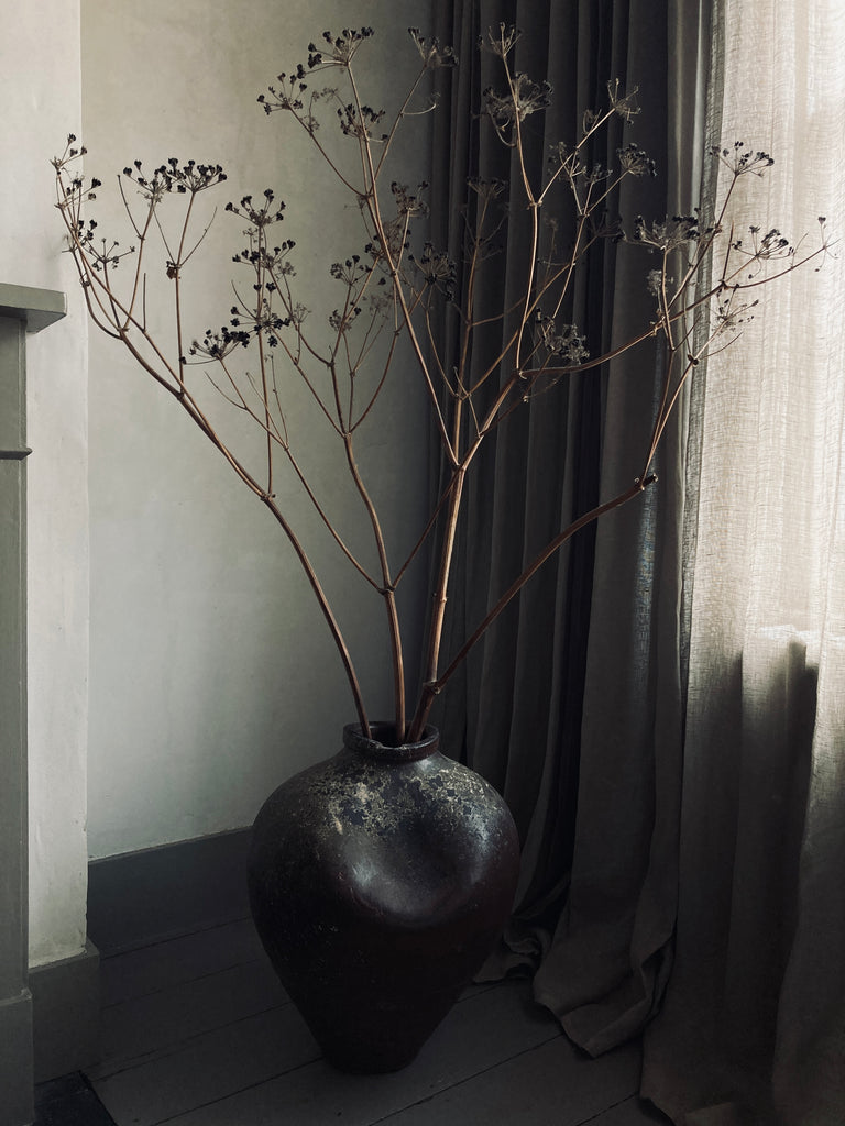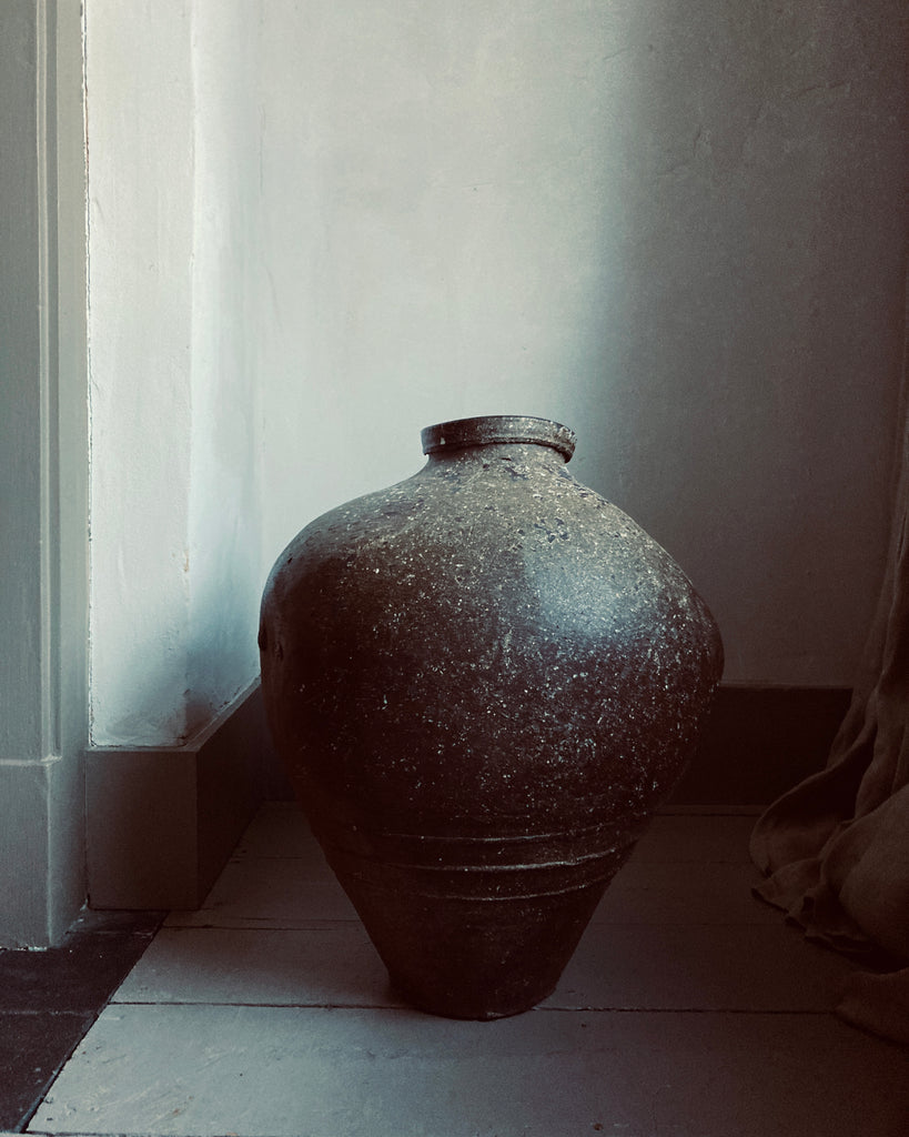 A beautiful large Chinese vessel originally used for storing vinegar and cooking wine. The asymmetry and original dent only adds to its character. It has a wonderful patina and a lovely rich brown glaze. Would look amazing on a plinth or floor standing.