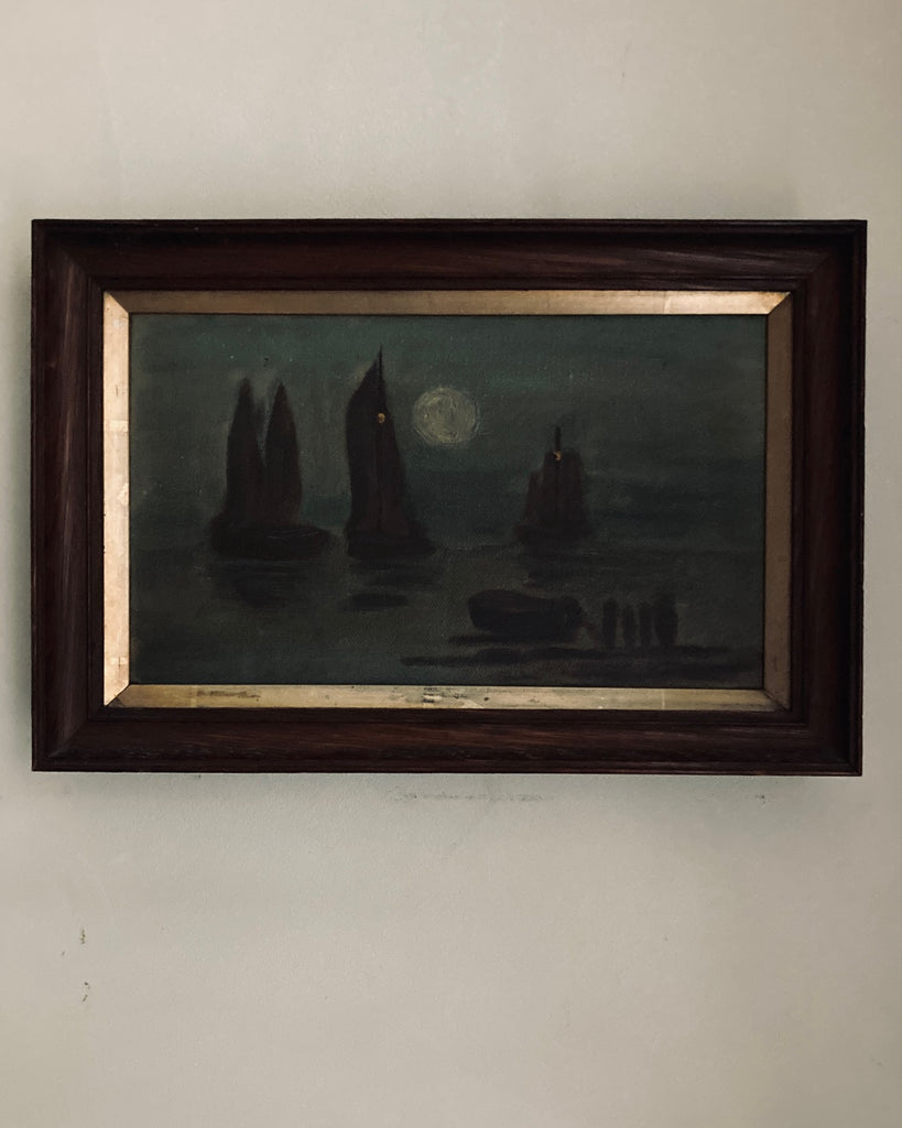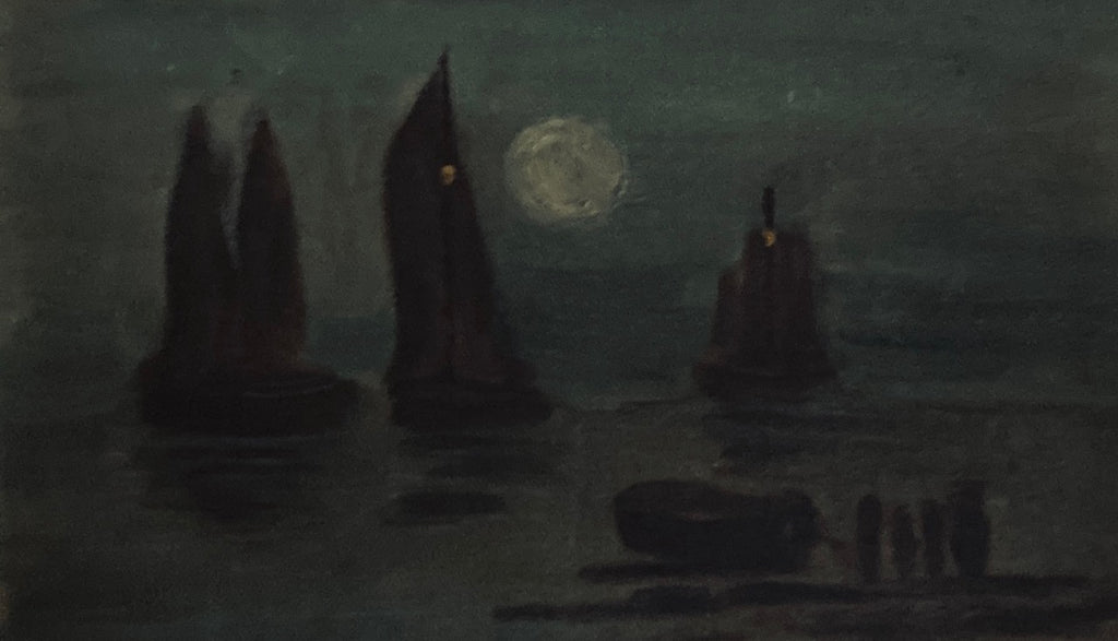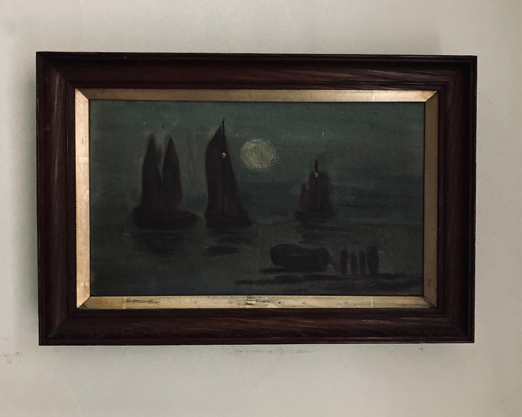 A lovely atmospheric oil on canvas painting of sailing or fishing boats by moonlight. I like to think they are Hastings Luggers but the stamp on the back is indistinct.